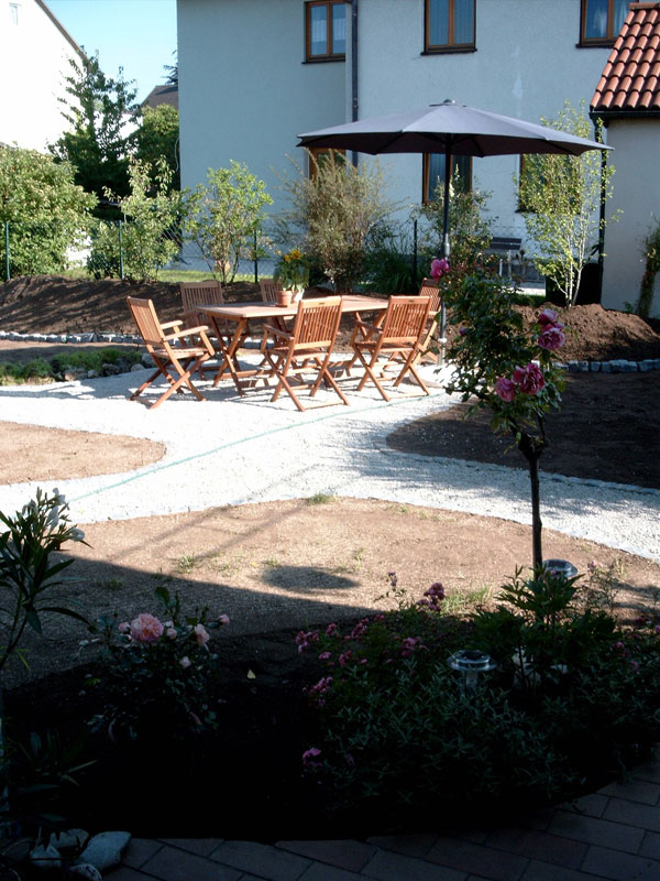 Geschwungene Wege führen nun zu einem Sitzplatz, ein Gartenhäuschen bietet Platz für Gartengeräte, Grill und vieles andere. Ein Wall, bepflanzt mit pflegeleichten Stauden und Büschen, schmiegt sich um den Sitzplatz, grenzt das Grundstück zum Nachbarhaus ab und erzeugt dadurch auch Sichtschutz.